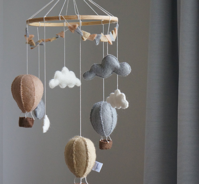 Beautiful and detailed mobile with airballoons and clouds. The mobile is beautifully wrapped with a cute ribbon - perfect gift to a babyshower, birthday or as a maternity gift.