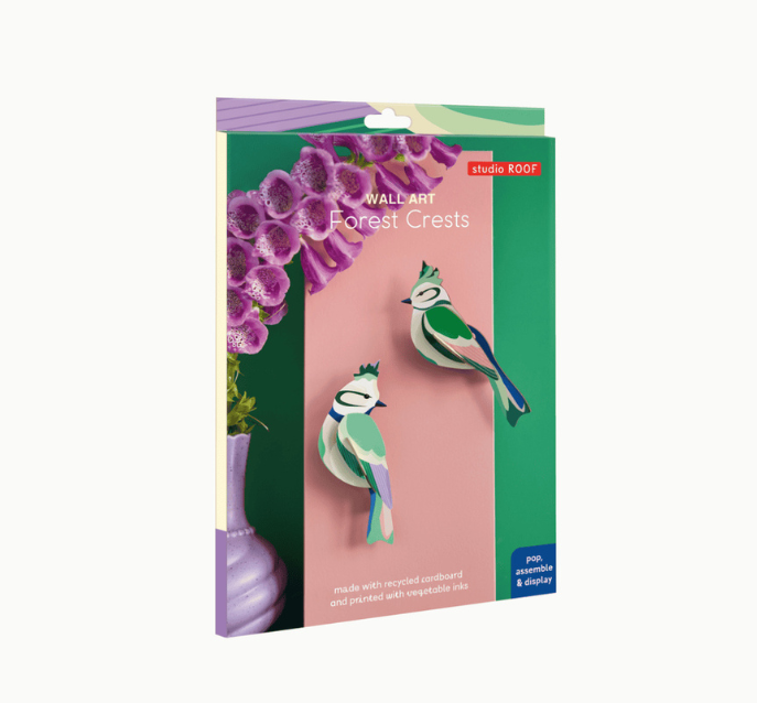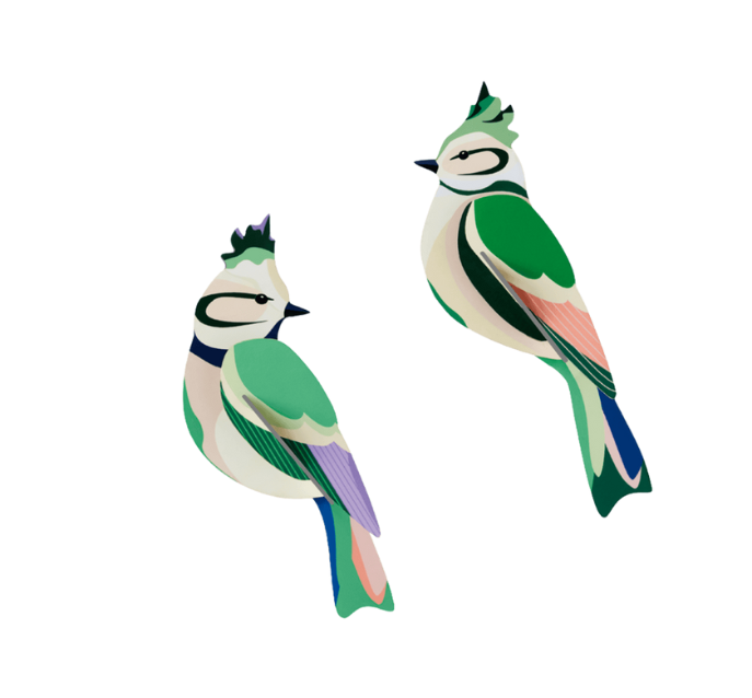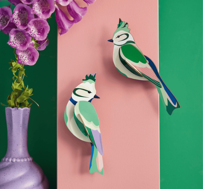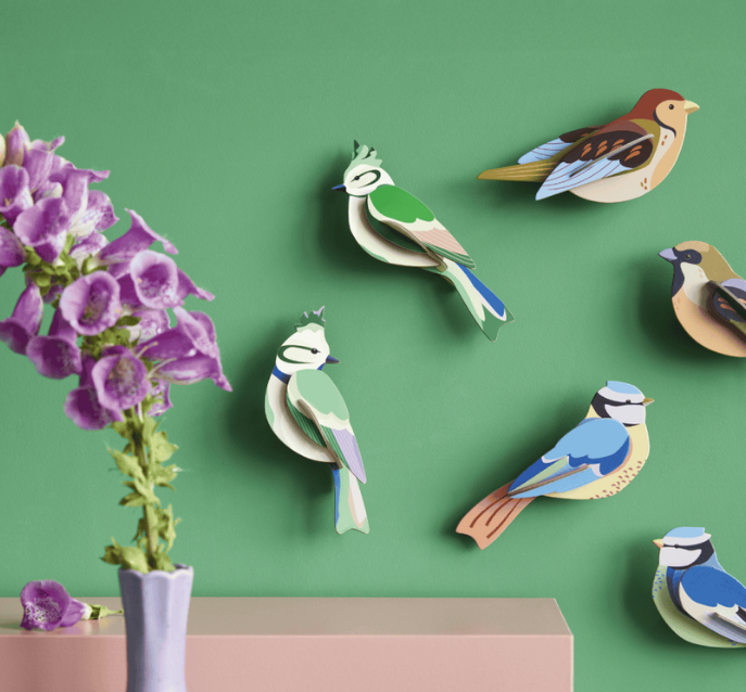 Garden birds chirp around us, pecking at some crumbs, glancing around, then fluttering away. They add color to our daily lives. These cardboard birds won’t fly away and can be given a lovely spot on your wall.