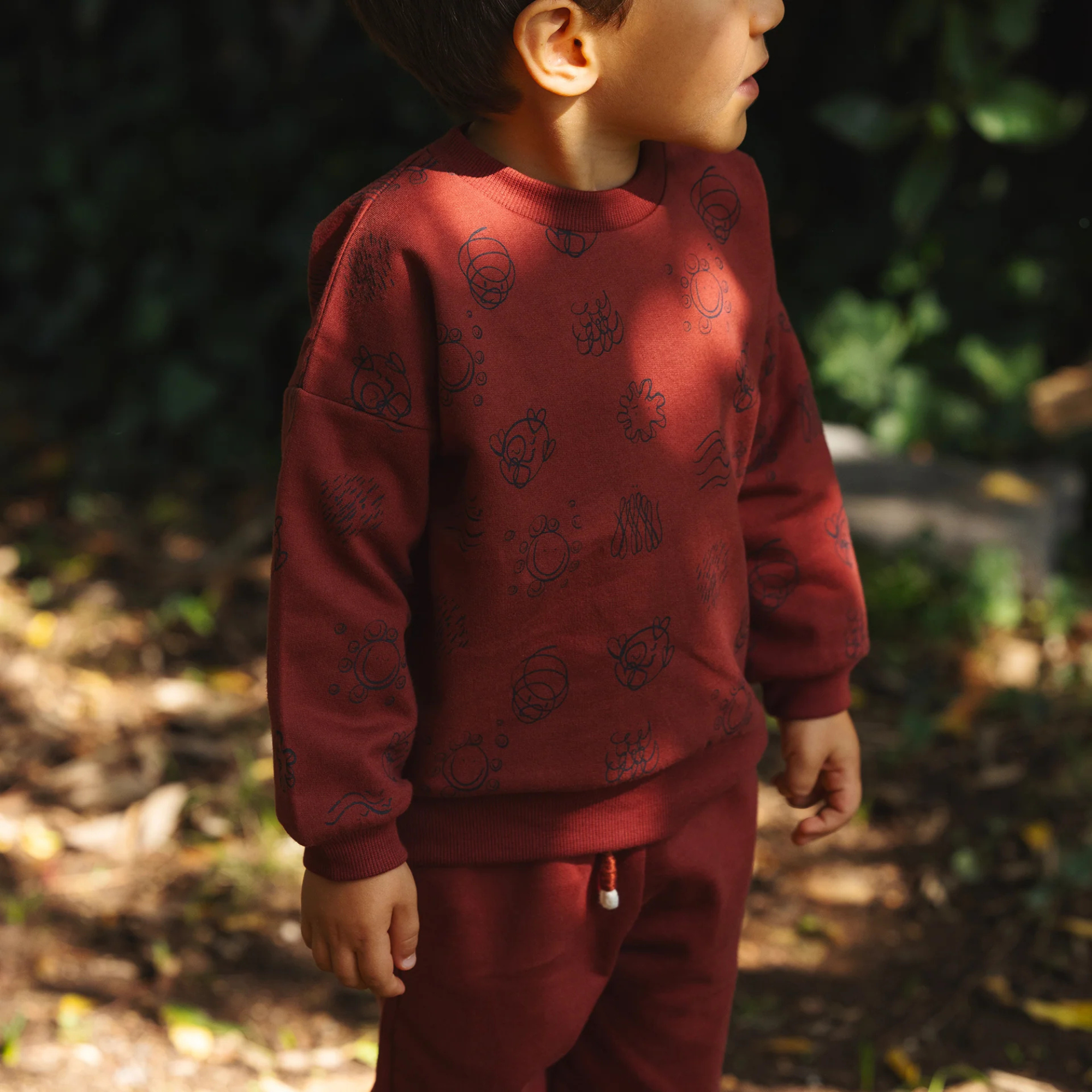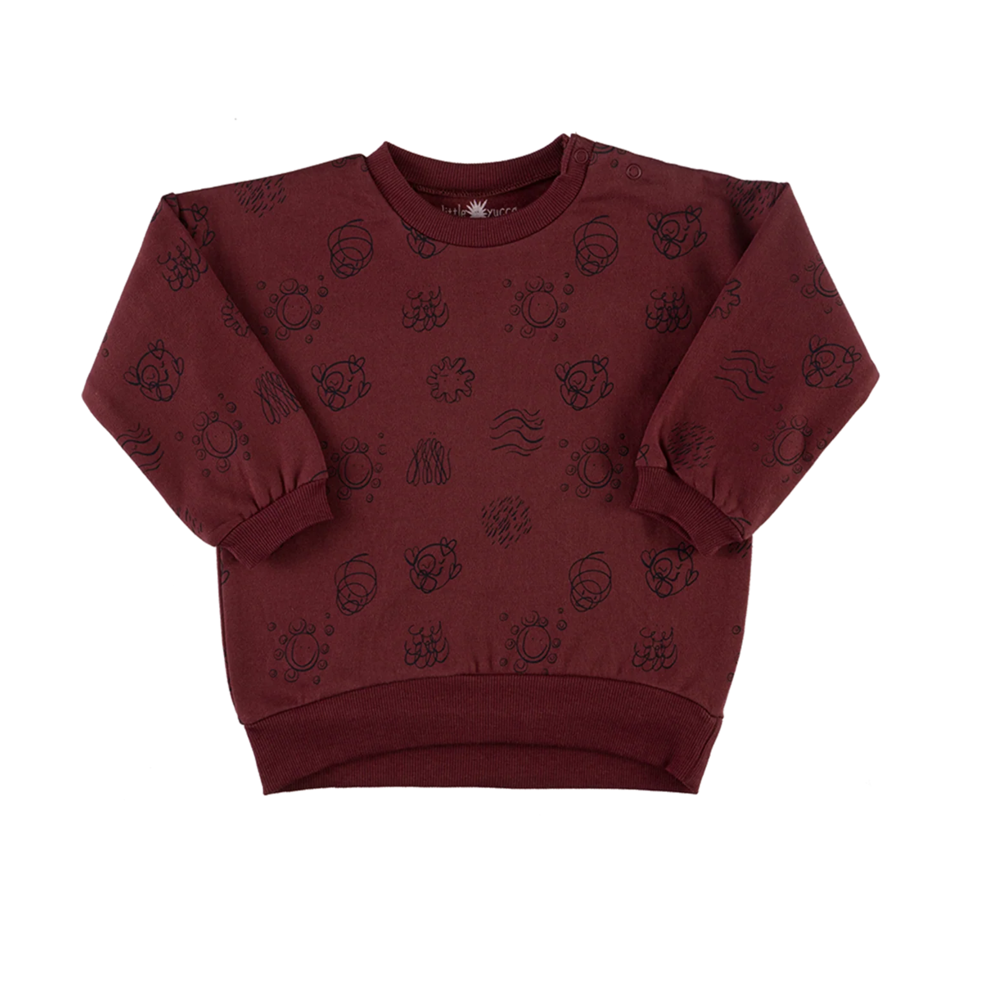 Loose cut sweatshirt with rib details. Sizes up to 3 years have snaps on the shoulder for easy dressing
