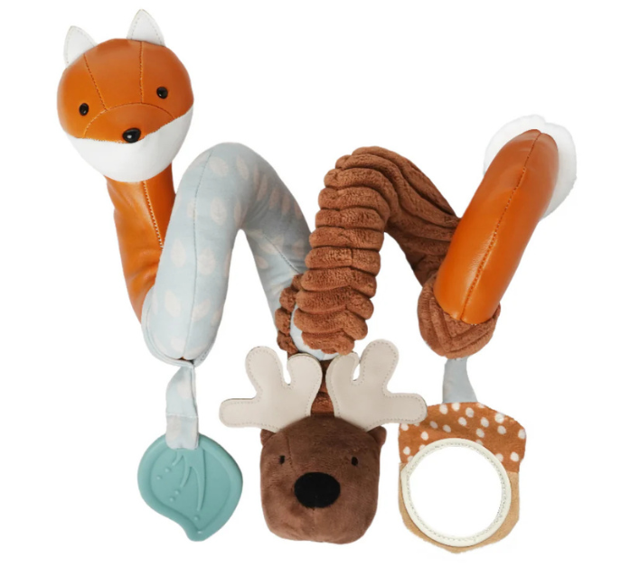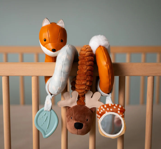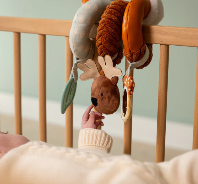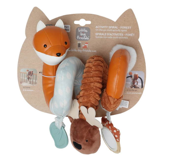 The Little Big Friends activity spiral Forest will amuse babies when in a stroller or a car seat. It can also be used in a bed or a crib. With the curiosity triggered by the activity spiral, babies’ senses are enhanced. Playful hanging toys are included to explore fun activities: animal maracas, a squeaker, a mirror, or a teether.