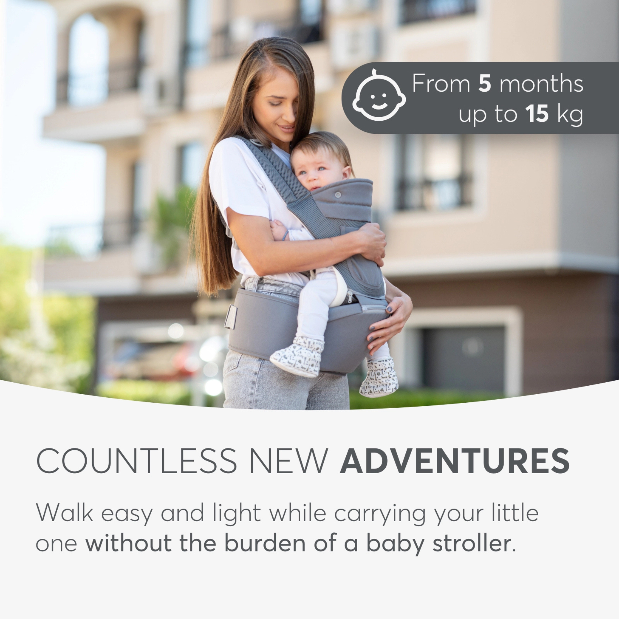 • Versatile Carrying Options - Offers eight carrying positions across three modes: inward facing from 5+ months, ideal for nurturing closeness; forward facing from 5+ months to engage with the world; and back carry from 6+ months for exploring adventures as they grow.