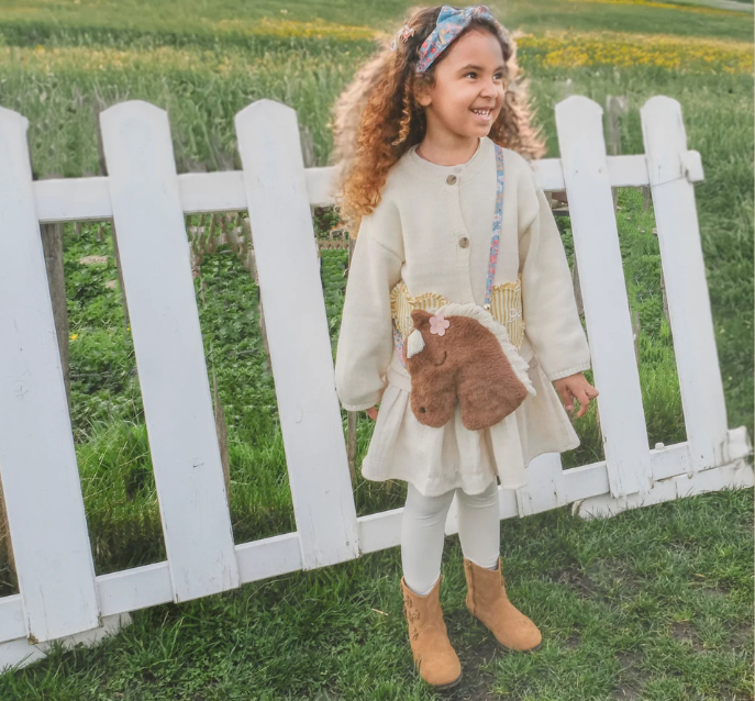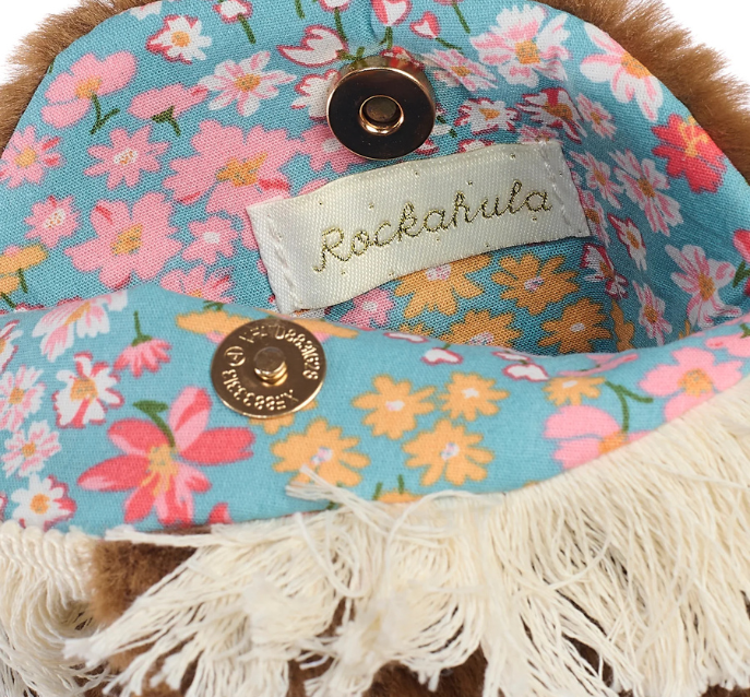 Giddy up Pony! Our Peggy Pony Bag is made from brown super soft faux fur with a sweet tuff mane and a little pink flower. This bag features a magnetic dot closure, our heidi floral fabric lining and adjustable strap with a break point for safety..