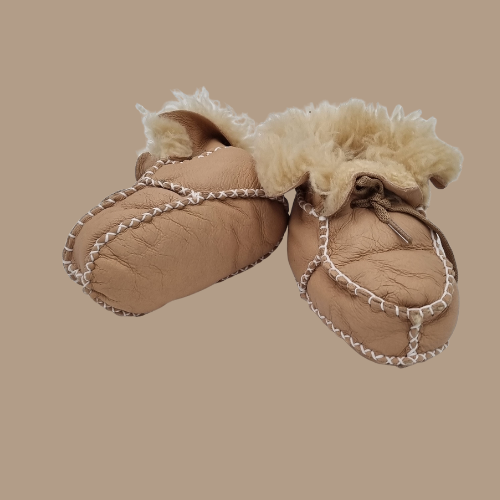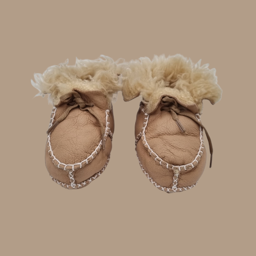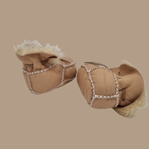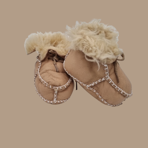 The Upcycled Leather Booties are crafted with recycled sheepskin, making them both eco-friendly and cozy. Your little one's feet will stay warm and comfortable with the sheepskin fur lining, while the hand-made design and tie-up feature ensures they won't slip off. Keep your baby's feet warm and the environment green with these stylish booties.