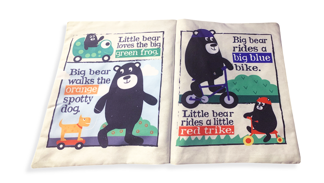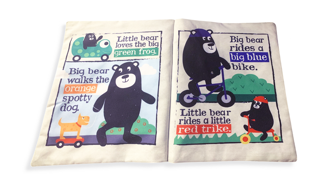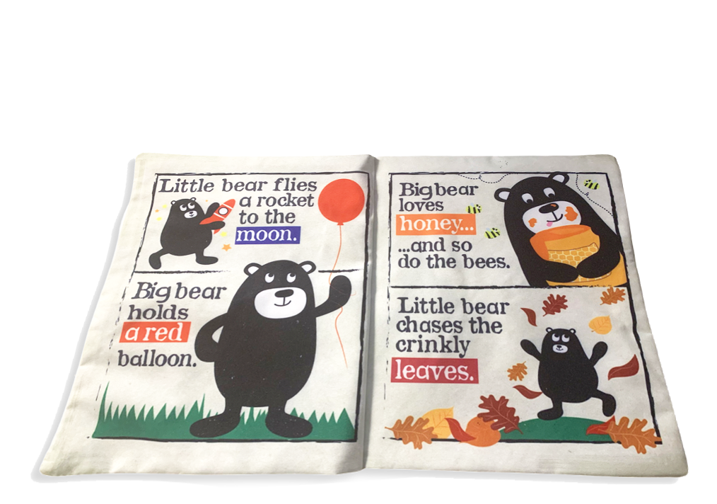 Nursery Times Crinkly Newspaper. Big Bear Little Bear. A great title for siblings showing the interaction between them. Dimensions approx: 30cm x 20cm. CE tested and machine washable. A practical, lightweight cloth book with crinkly pages. A great sensory toy. A unique gift. Each newspaper is packed in a gifting envelope to add 'To' and 'From' and a short message.