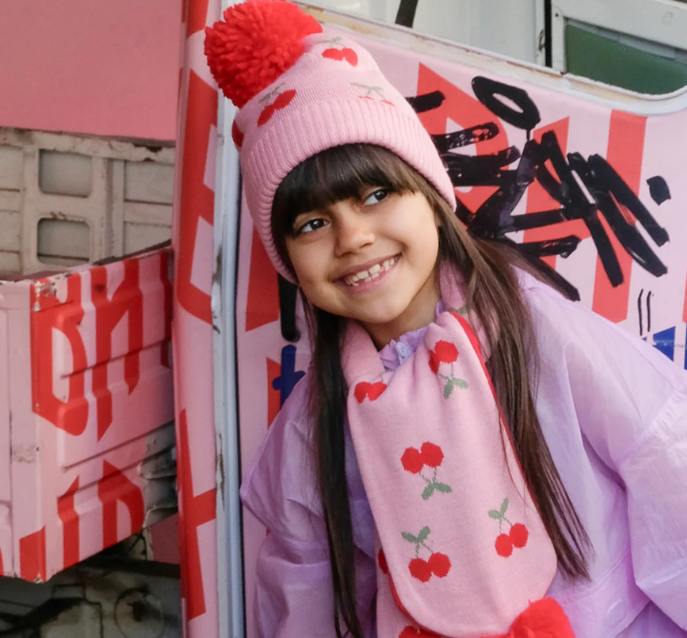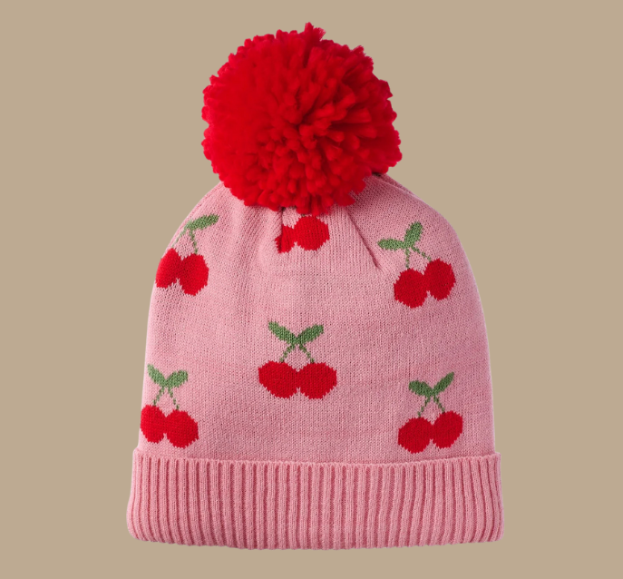 Add a pop of colour to any cold wintery day with our cheerful cherry knitted hat. Adorned with bright red cherries and a red pom pom, this hat is fleece lined for extra warmth