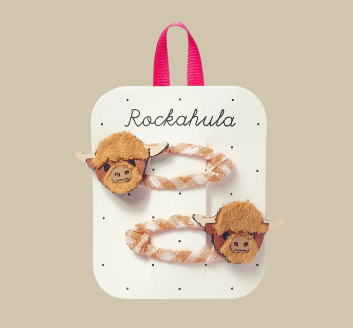 Hettie Highland Cow is udderly adorable! Two super soft Highland Cows adorn these sweet gingham ribbon wrapped snap clips. The perfect way to add a little countryside charm or a touch of farmyard fun to any outfit!