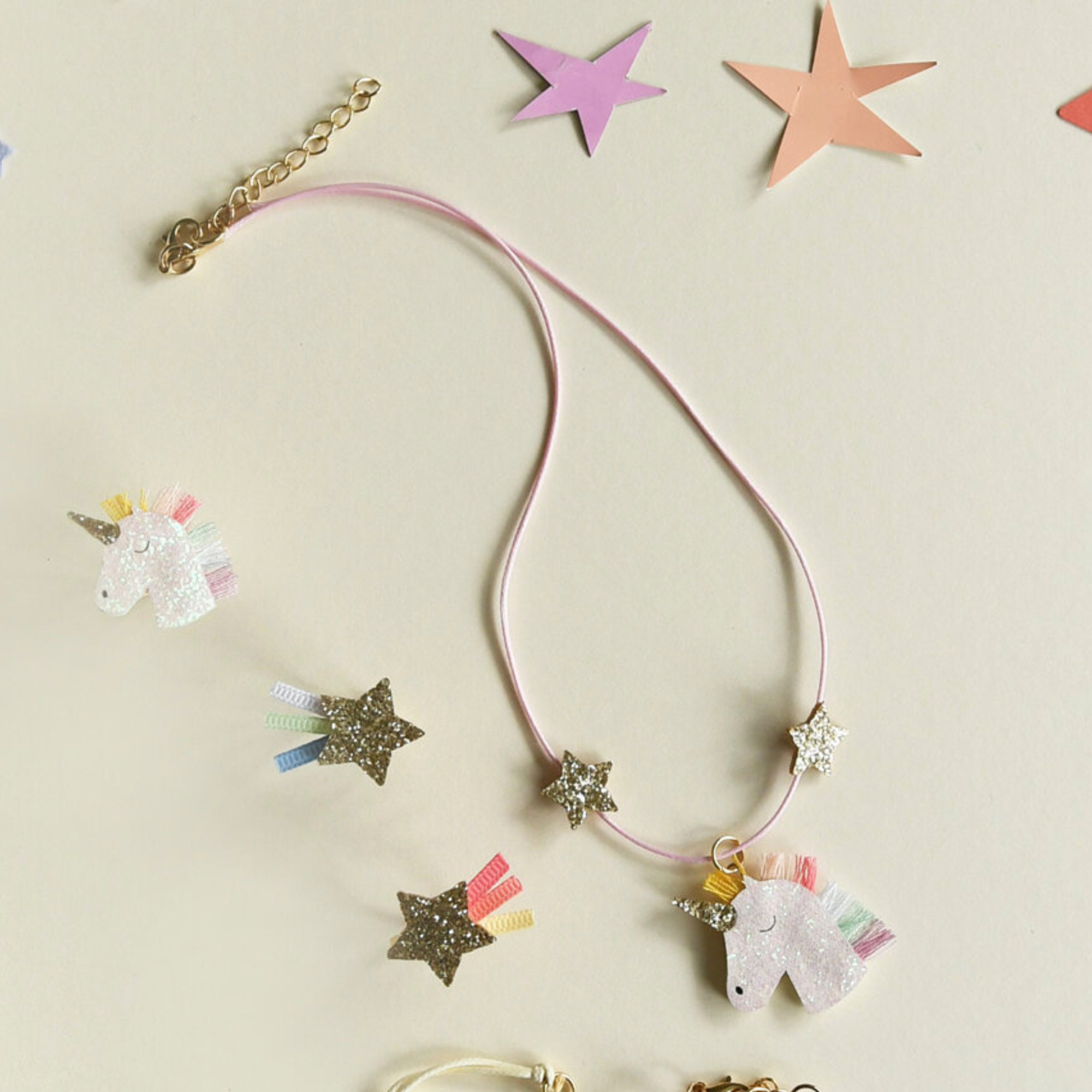 We believe in unicorns, and so can you with our rainbow unicorn necklace! Featuring our glittering unicorn with a rainbow mane and two gold glitter stars, set on a pretty pink cord with a lobster clasp fastening and extender chain to ensure the perfect fit.