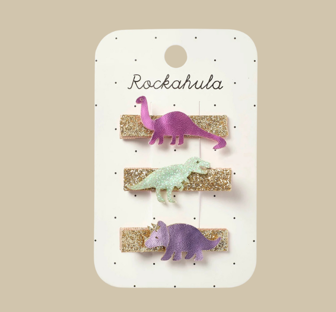 Our shimmering dinosaur bar clips are totally roar-some!! A pack of three bar clips each adorned with a bright glittery or PU dinosaur! A diplodocus, a t-rex or a triceratops - wear them one at a time or all at once!