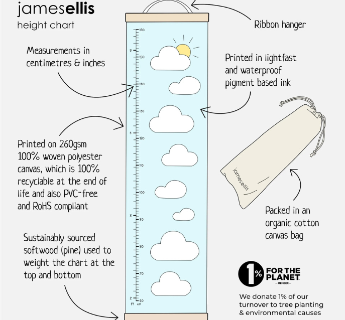 The height chart includes measurements in both centimeters and feet and inches. The measurements start at 60 cm / 2 ft and go up to 160cm / 5 ft 3in