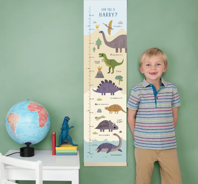 A colourful dinosaur height chart, illustrated by Linda Tordoff.