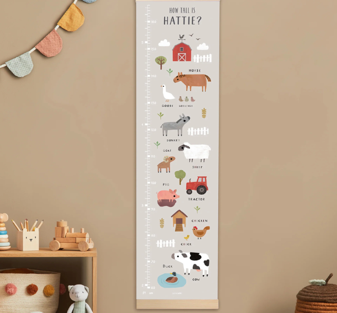 A colourful farm themed height chart, illustrated by Linda Tordoff.