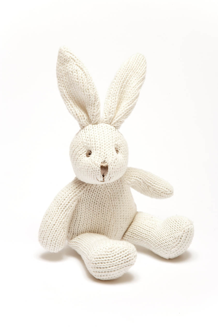 Cute knitted white cotton bunny soft toy with a sweet smile and a twinkle in his eye. Bunnies are always popular baby toys and this little bunny rattle is suitable from birth and makes the perfect new baby gift or baby shower gift.