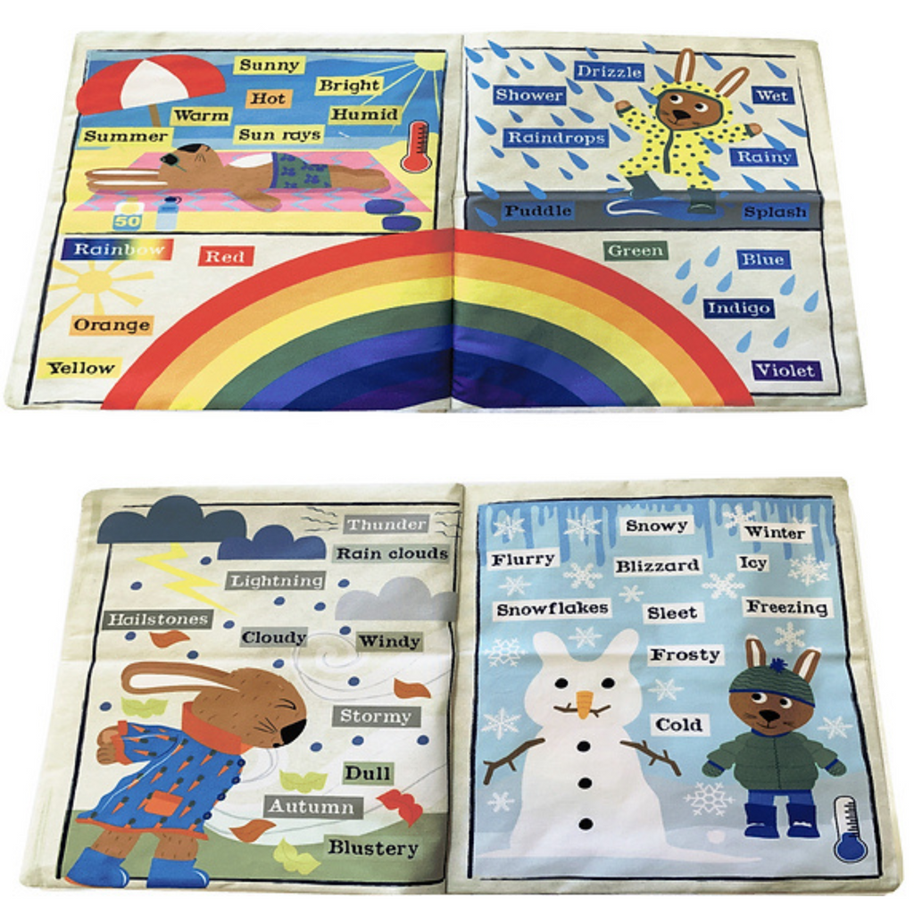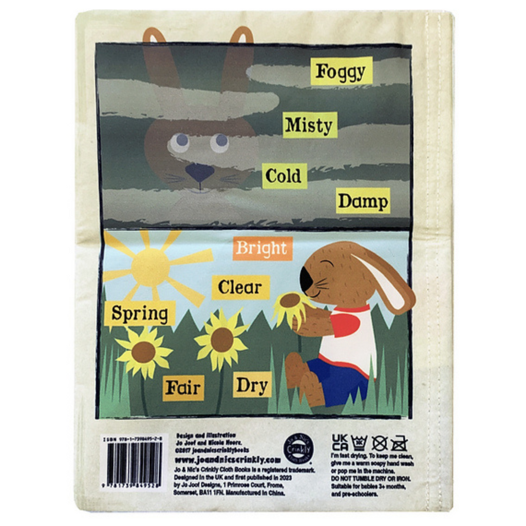 Nursery Times Crinkly Newspaper. All Kinds of Weather. 6 pages of fun illustrations about the weather, featuring a Bunny. A first words title. Dimensions approx: 30cm x 20cm. CE tested and machine washable. A practical, lightweight cloth book with crinkly pages. A great sensory toy. A unique gift. Each newspaper is packed in a gifting envelope to add 'To' and 'From' and a short message.