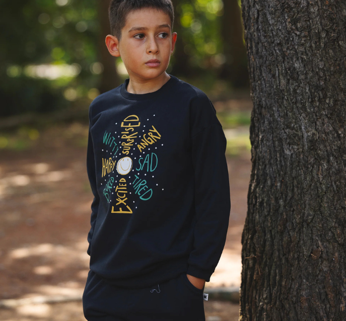 Loose cut sweatshirt with rib details. Sizes up to 3 years have snaps on the shoulder for easy dressing