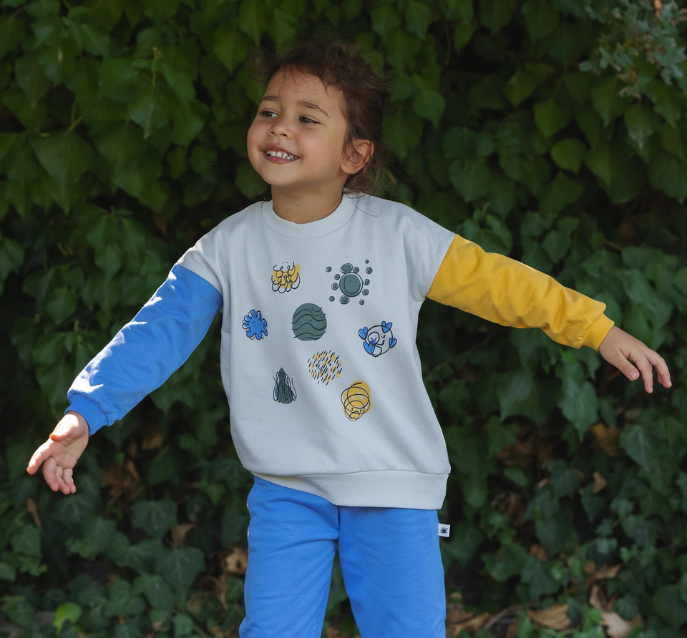 Loose cut sweatshirt with rib details. Sizes up to 3 years have snaps on the shoulder for easy dressing