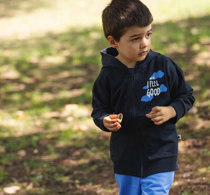 Loose cut sweatshirt with rib details. Sizes up to 3 years have snaps on the shoulder for easy dressing