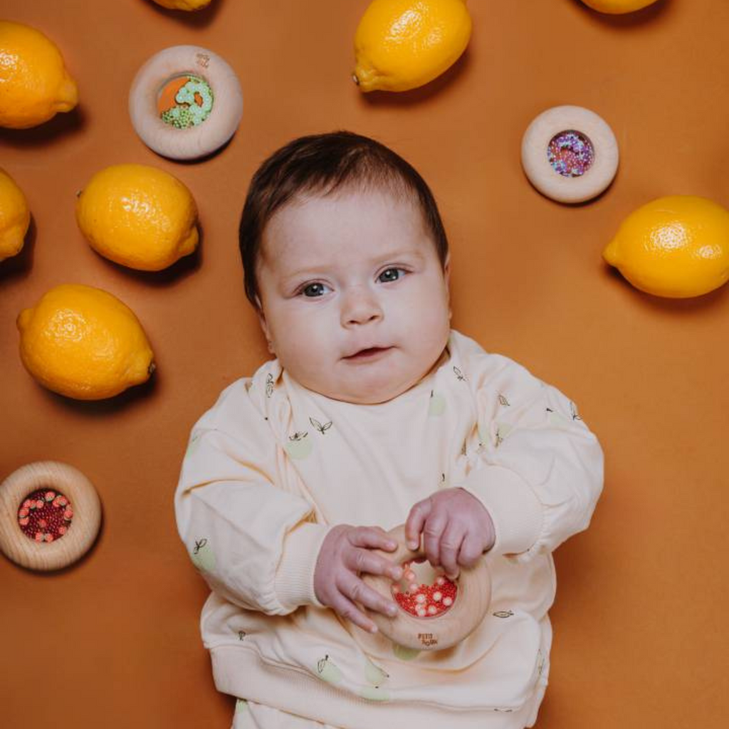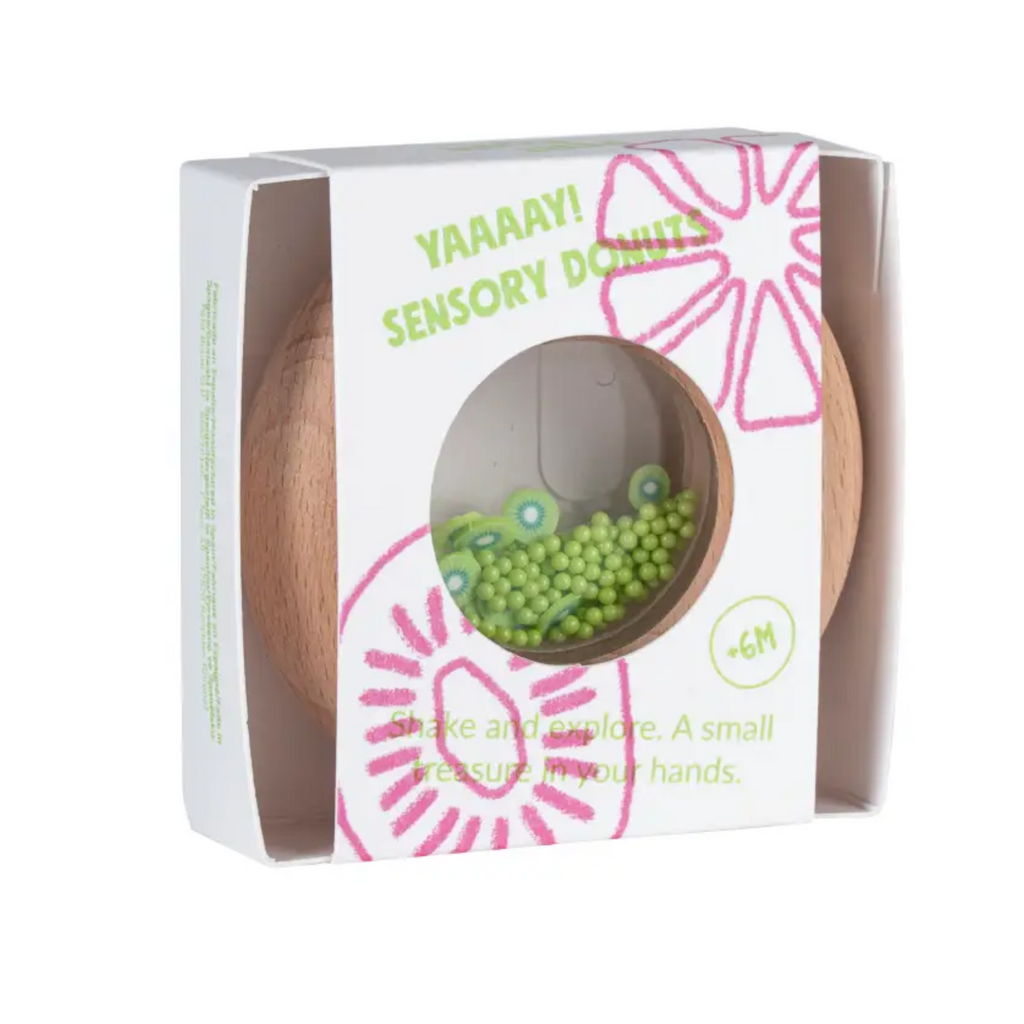 These smooth wooden rattles in the shape of a donut, are perfect for little hands to grip comfortably. Inside, you can identify yummy fruits and vegetables shapes, which, when shaken, unleash an irresistible sensory sound.Made of natural beech wood, our delicious donuts are bite-proof, are free of toxins, and designed to delight, promoting healthy eating from the earliest age. Why not collect them all!
