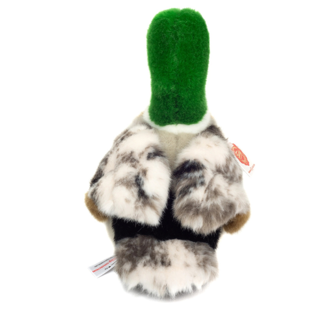 The 24 cm tall wild duck is a colorful representative of the Hermann Teddy Collection. The yellow, eye-catching beak, the brown-black button eyes, the intricate pattern and the cute webbed feet reveal a high level of detail and their fur, which is based on the plumage and coloring of male mallards, is incredibly soft and invites you to pet and cuddle.