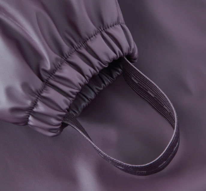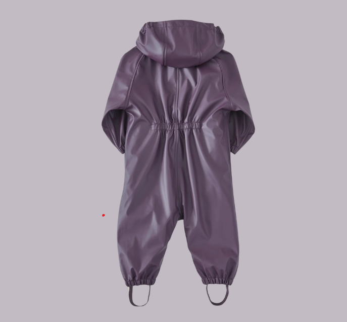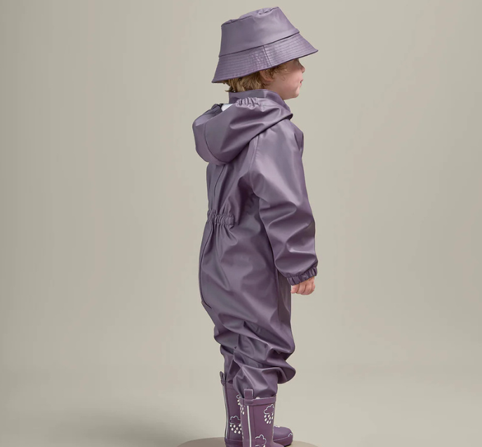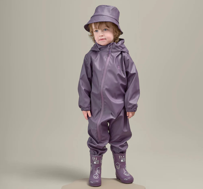 This stylish kids' puddlesuit brings a sense of adventure to your toddler's rainy days. Including an elasticated hood, cuffs, and back for a secure fit, this deep purple rain suit takes inspiration from the Icelandic Fjords.