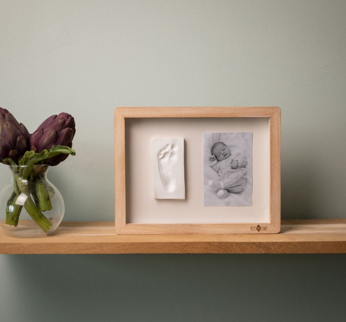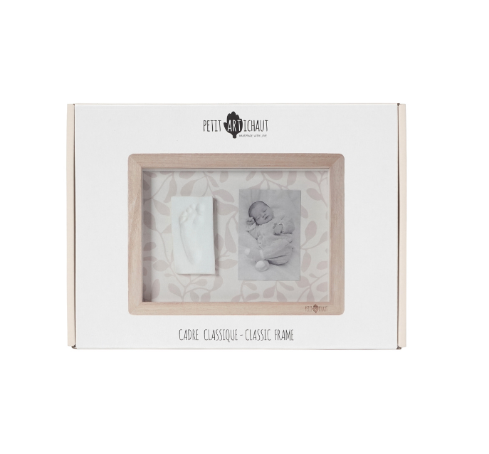 The Classic Frame - Ivy Grey is designed to showcase both a photograph and a baby imprint. This traditional wall-hanging frame has a customizable reversible beige background with or without a foliage pattern. Included in the kit are hypoallergenic clay, a roller, and instructions to easily create your print.