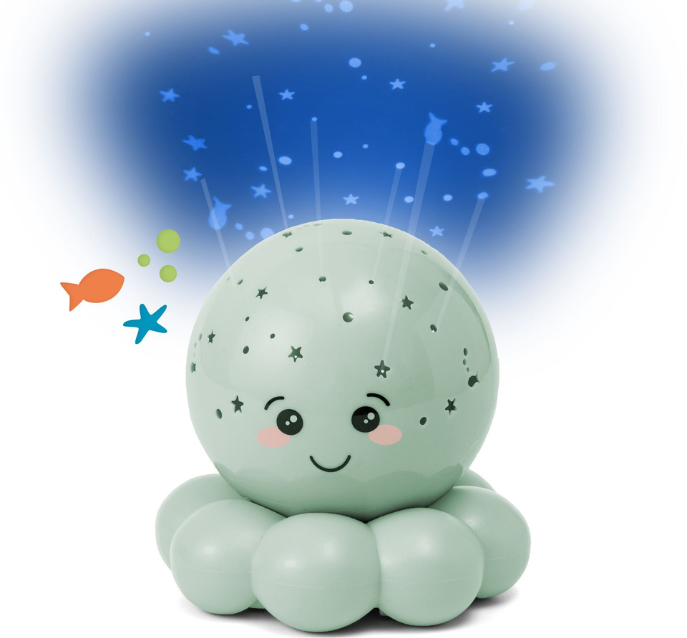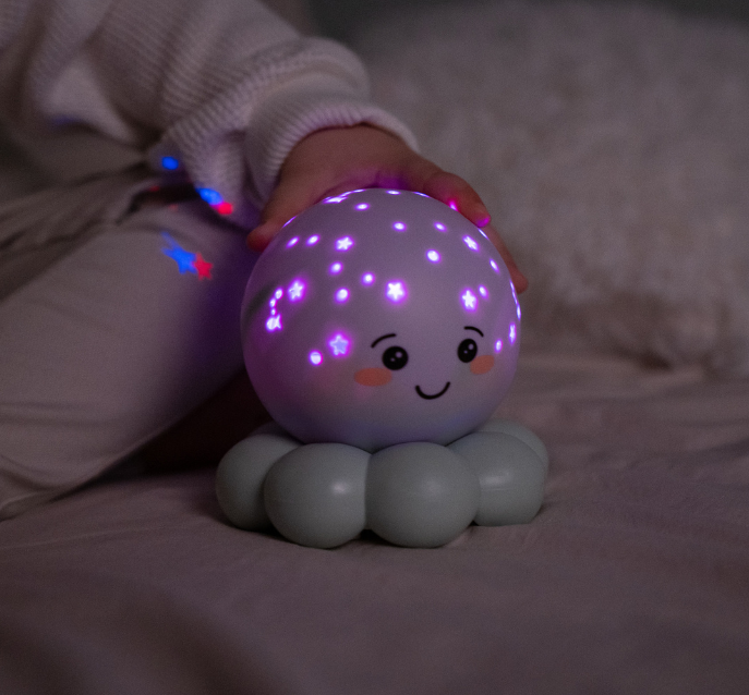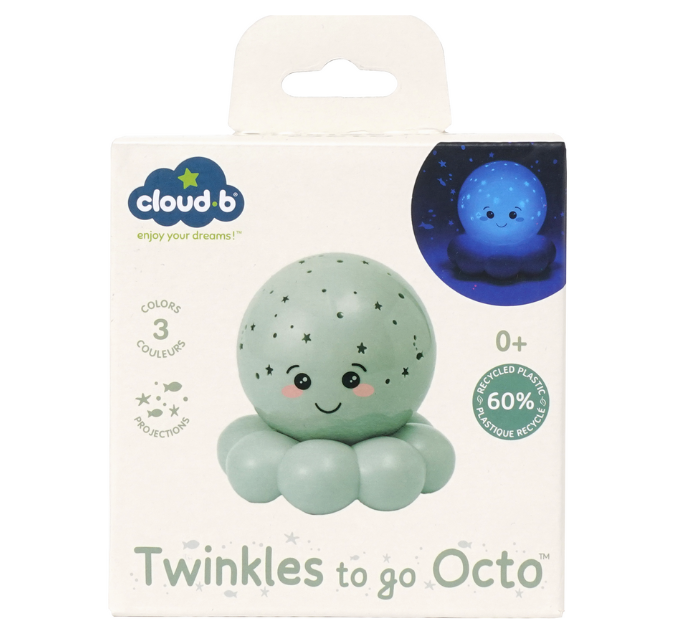 Twinkles To Go Octo™ was made for traveling, transforming any dark, scary new place into an underwater dreamland and making your little bug feel all snug and sleepy. Our bubbly octopus night light is bound to be an absolute must-have for traveling families - whether in the backseat, or the hotel suite! Twinkles glows soft bubbling fish and stars night after night. Twinkles features LED lights that keep the Octo's body cool, safe and long-lasting. And, with no cords to tangle with, Twinkles is always ready to travel. This incredibly lightweight, traveling nightlight has one on/off button. Press the button twice to change color setting. After 45 soothing minutes of stars and fish, an auto shut-off feature turns Octo off. Sleep is just a little bit sweeter with this glowing octopus who encourages quality, restful sleep. Bring all the comforts of home on the road with Twinkles To Go Octo™!