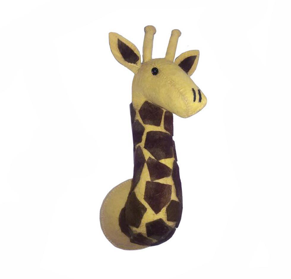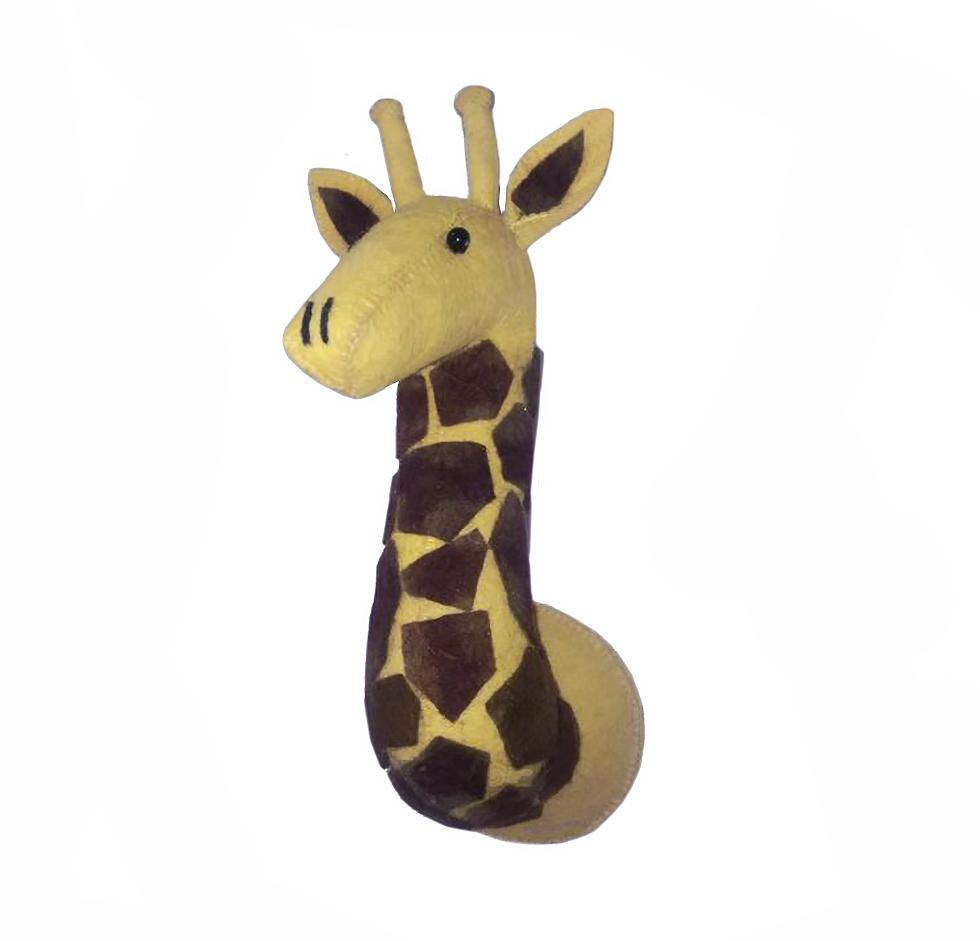 Our beautiful felt Giraffe Head wall decoration by Fiona Walker England is elegant and handsome, with golden patches and pink ear details. Although he likes nothing better than munching on leaves from the tallest trees, he is just as happy sitting on your bedroom wall.
