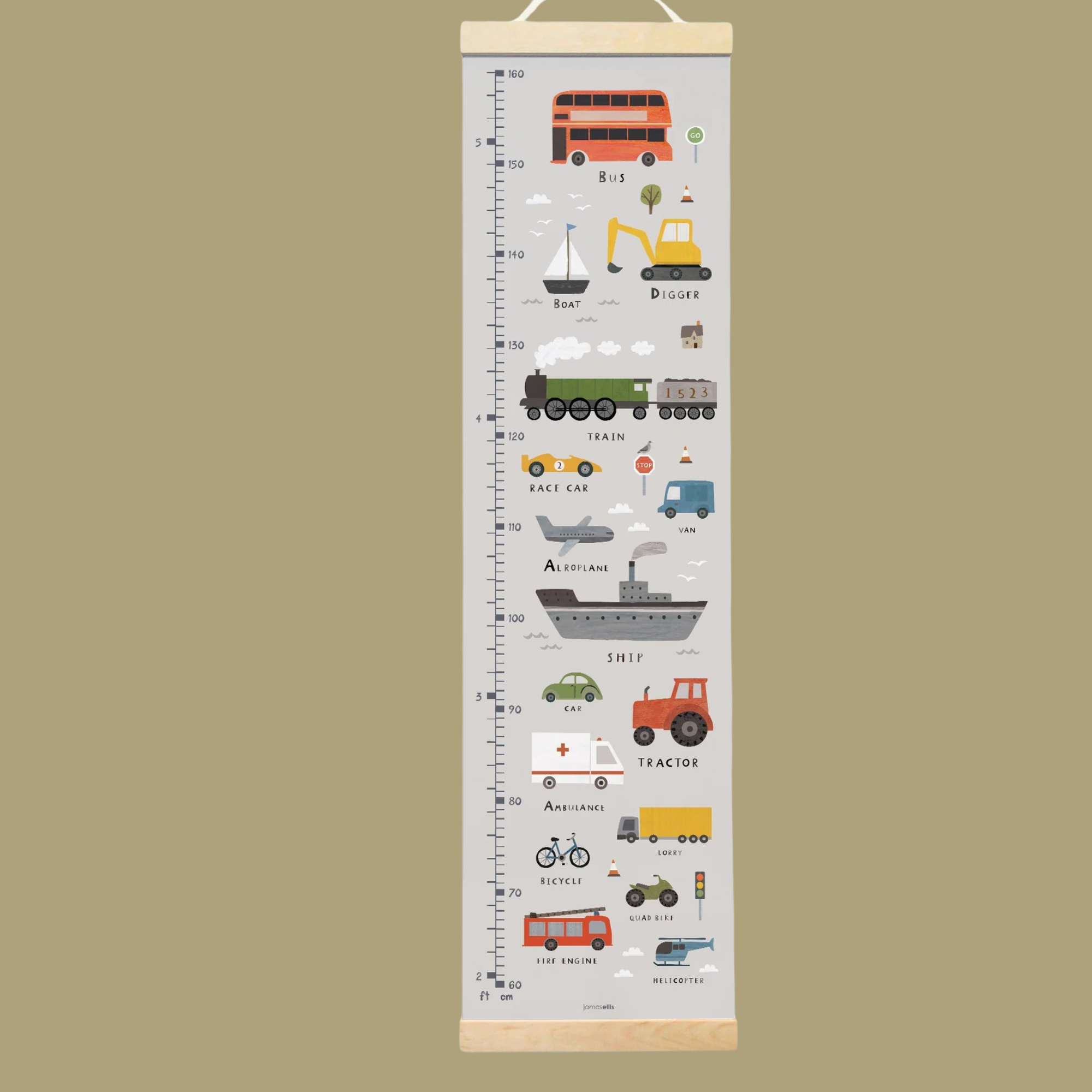 A beautiful transport themed alphabet height chart with a wooden hanger, illustrated by Linda Tordoff.