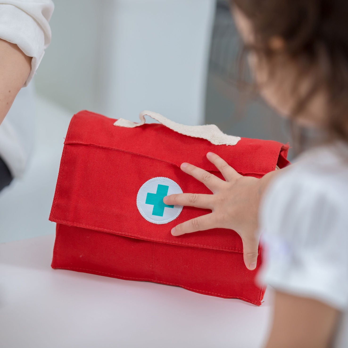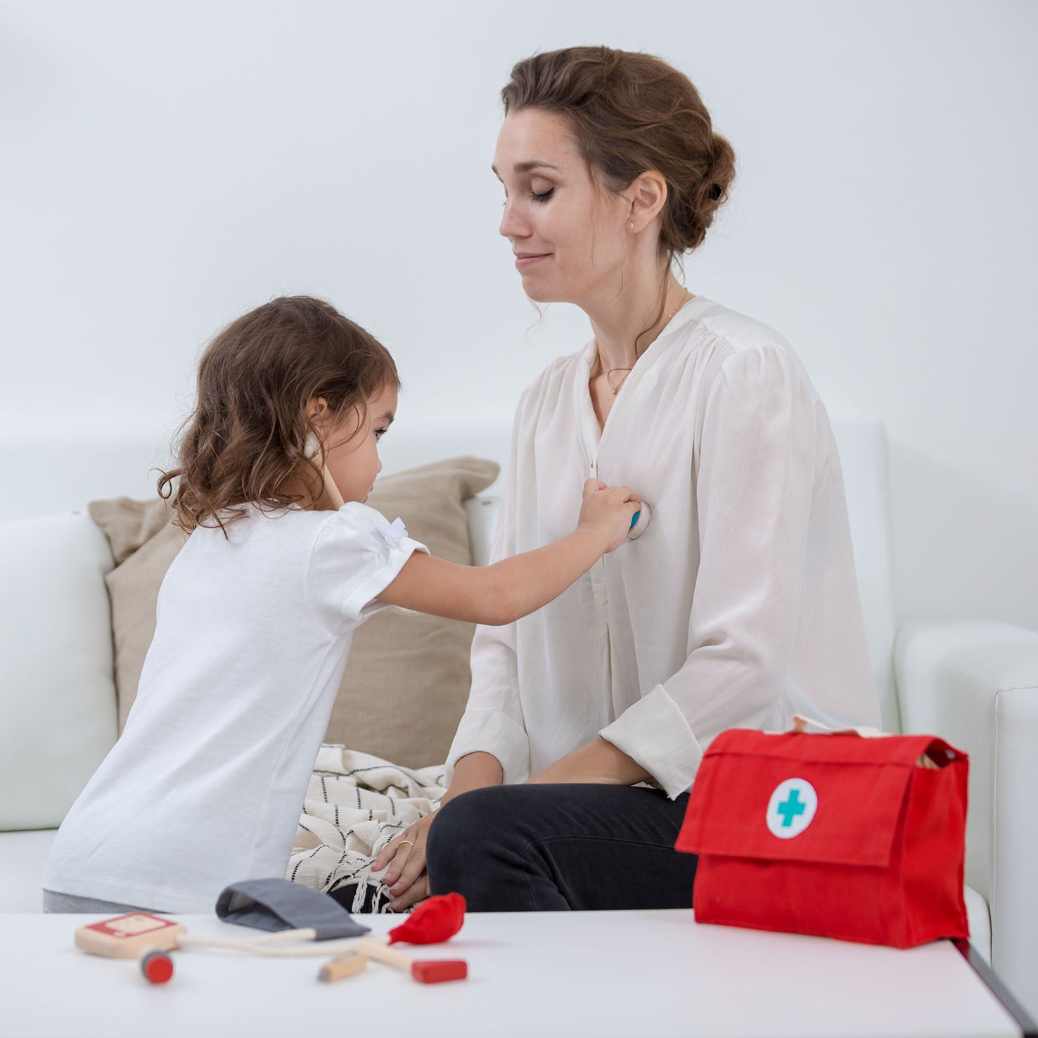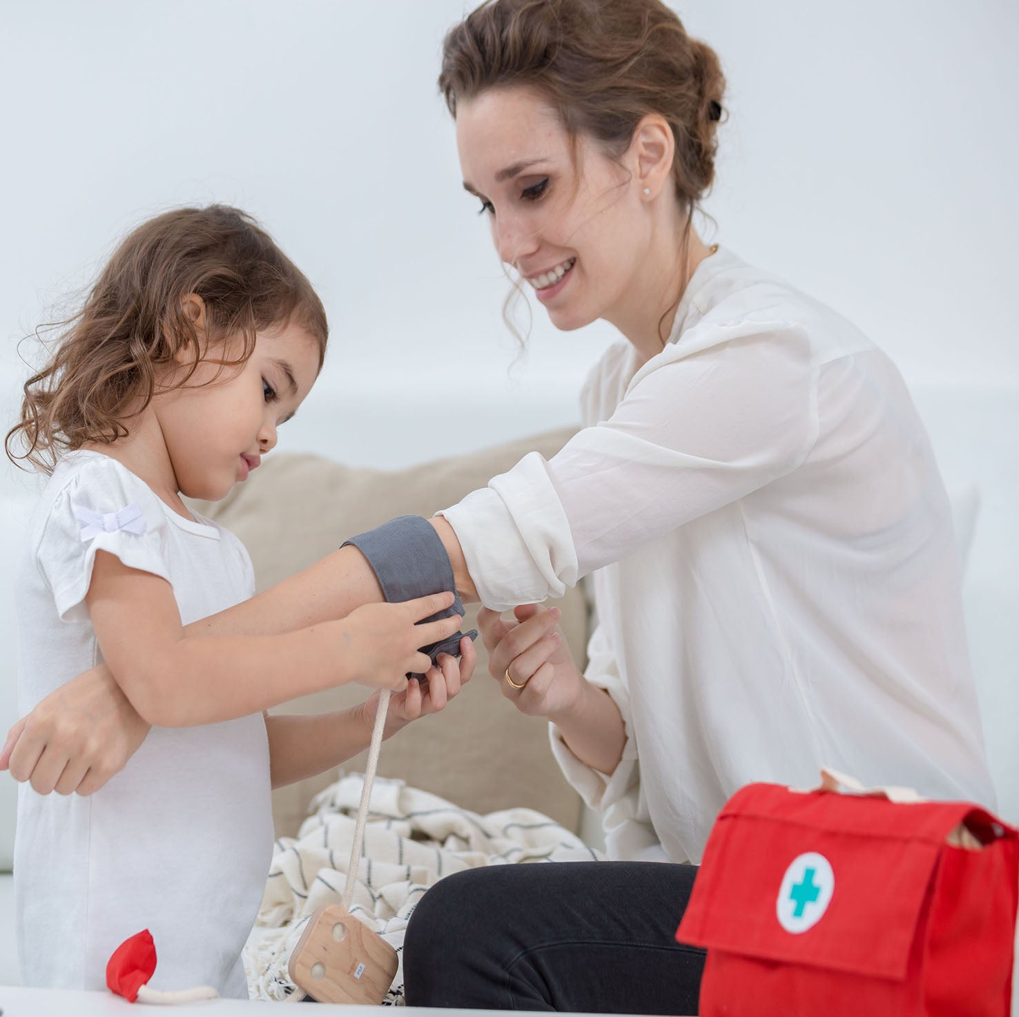There are 5 medical instruments, a blood pressure monitor, stethoscope, reflex hammer, syringe and thermometer all contained in a red doctors bag. Perfect for imaginative play and teaching empathy and sympathy. This ethically made wooden toy set makes a perfect gift.