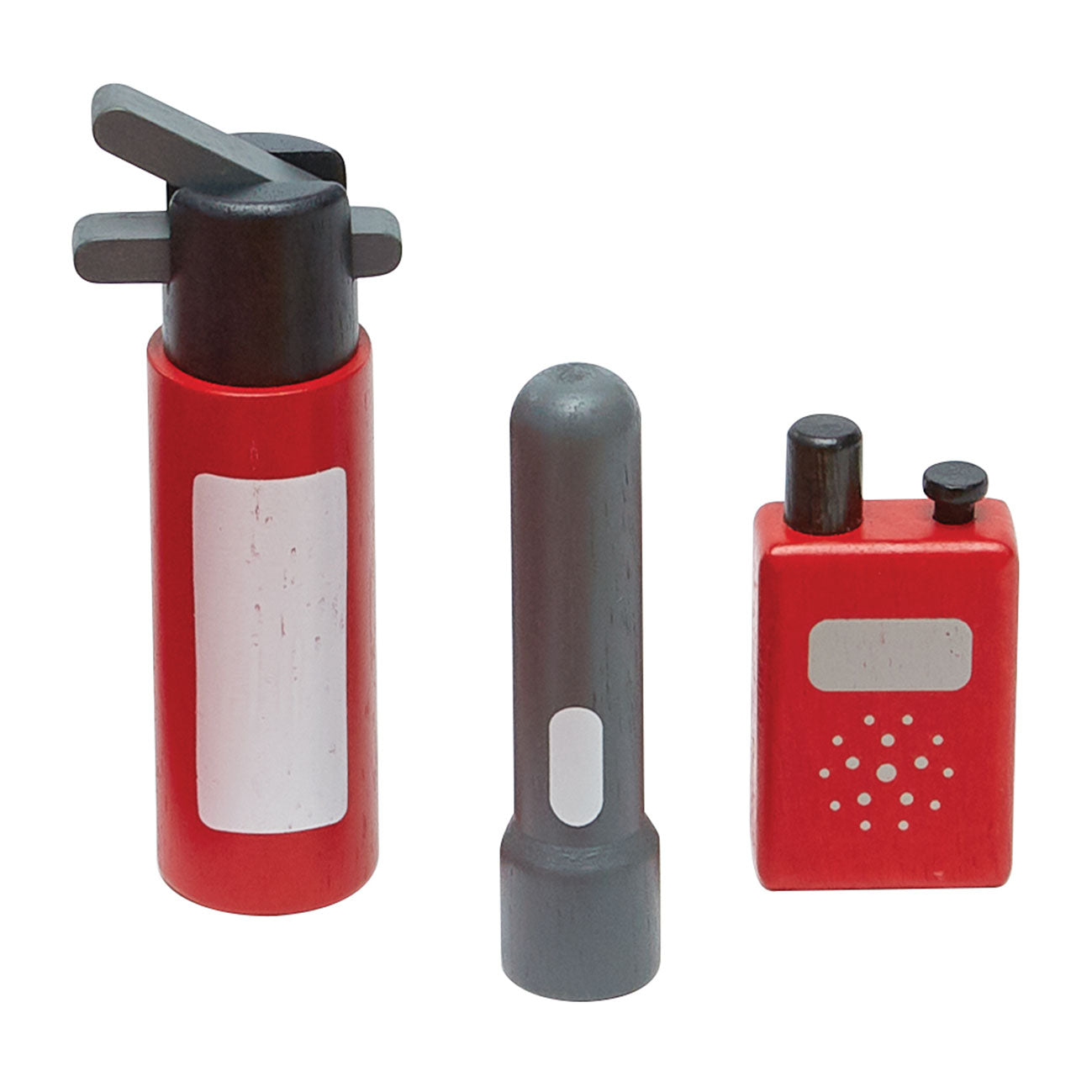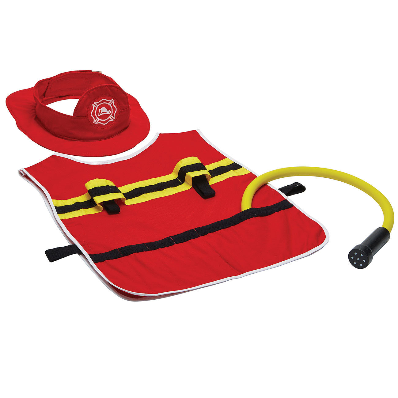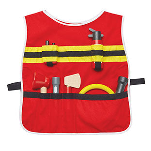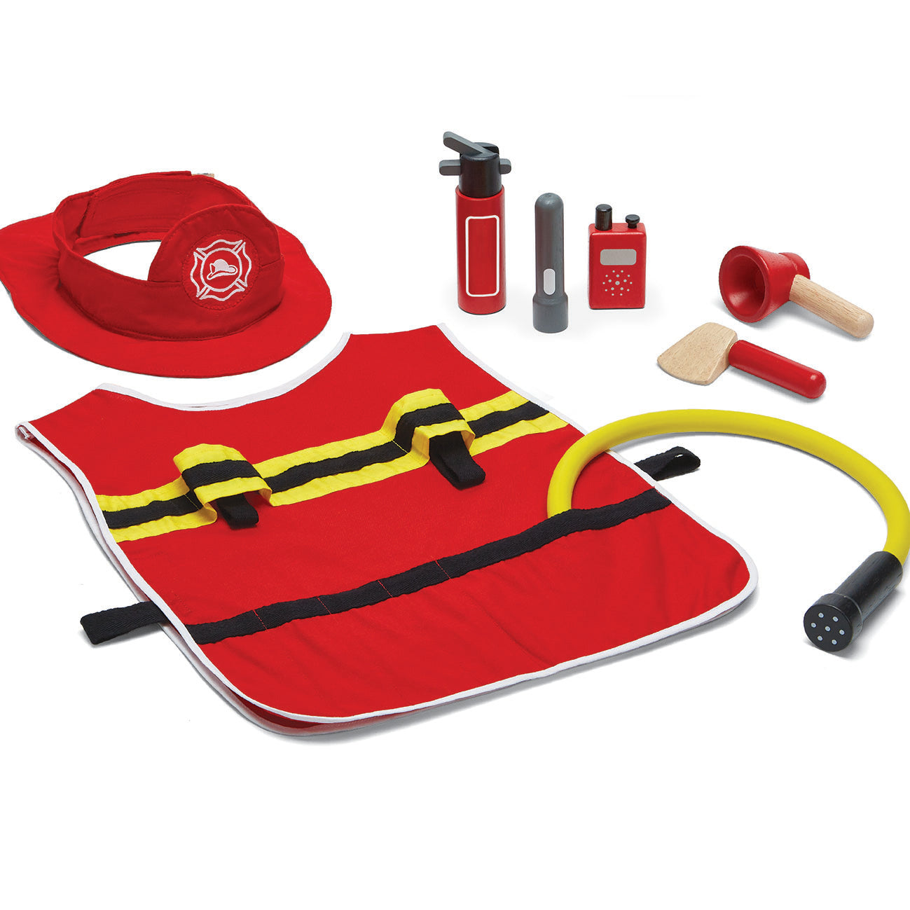 • Set includes an adjustable helmet and jacket, megaphone, fire extinguisher, water hose, flashlight, hatchet and walkie talkie