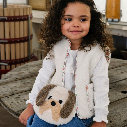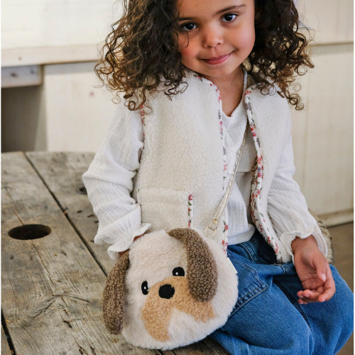 Our darling Dolly Dog will set little tails wagging! Made from the softest faux fur fabric, with floppy boucle ears, boucle moustache and a sweet embroidery face. Fully lined in brown heart scattered fabric, this bag features a magnetic dot closure and a strap with a break point for safety.