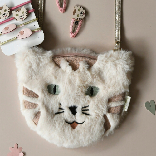 Our Tabby Cat bag is purrr-fect in every way! Made from super soft dusky ivory faux fur with a sweet embroidered face and shimmer fabric accents. This bag features a magnetic dot closure, a gold heart lining and an adjustable gold strap with a break point for safety.
